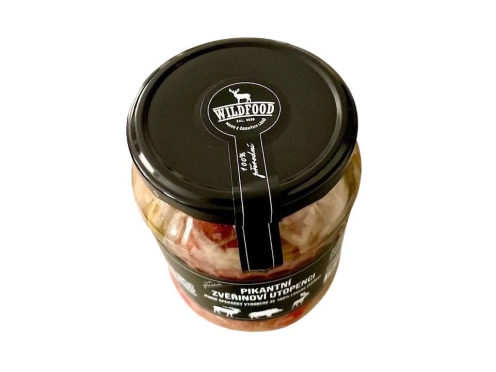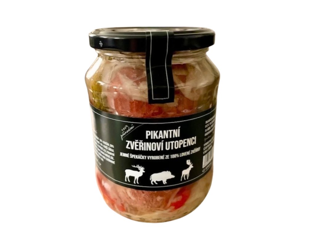 Zvěřinoví utopenci jsou jedinečný výrobek značky Wildfood s.r.o., připravený výhradně ze 100% lovené zvěřiny. Základem jsou zvěřinové špekáčky, vyrobené tradičním způsobem v rodinné firmě a ručně vázané, bez průmyslových zkratek.