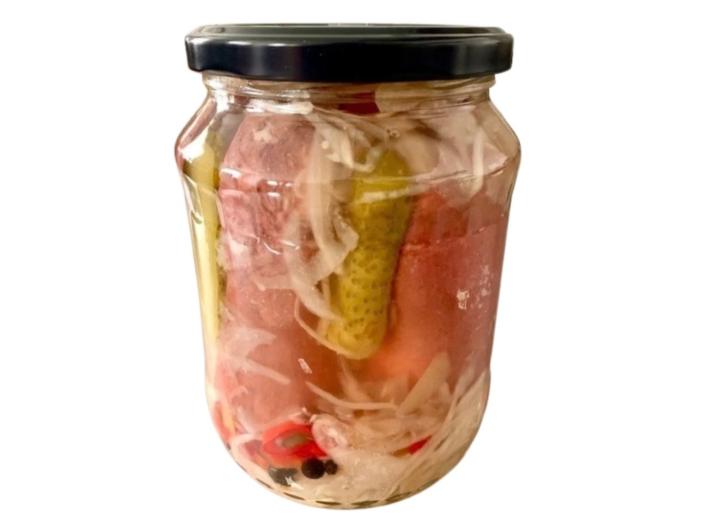 Zvěřinoví utopenci ze 100% lovené zvěřiny. Tradiční ruční výroba, zvěřinové špekáčky v nálevu se zeleninou.